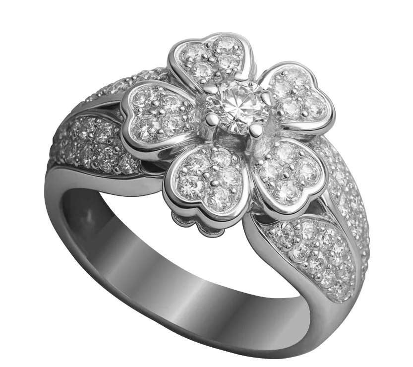 Our high-polished Flower Art ring is paved-set with fine natural diamonds with a total weight of 0.96ct. The band measures 12.8mm in width and is available in all precious metals.
