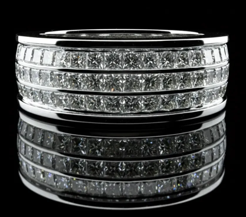 This sumptuous eternity ring is the perfect gift if you're looking for something to make an impression on a big occasion. Art Deco style princess diamond compete in glimmer with radiant princess diamonds. Perfect for anyone who adores luxurious diamond jewellery with a touch of vintage opulence.
